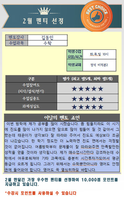 2¿ù ÇÑ´Þµ¿¾È ¼ö¾÷Âü¿©µµ¿Í ÁýÁßµµ ¼º½Çµµ°¡ ¿ì¼öÇÑ ¸àƼ¸¦ ¼±¹ßÇÏ¿© Æ÷ÀÎÆ® 10,000Á¡À» Áö±ÞÇÏ¿© ÀÀ¿øÀÇ ¸Þ¼¼Áö¸¦ Àü´ÞÇϰí ÇÕ´Ï´Ù
